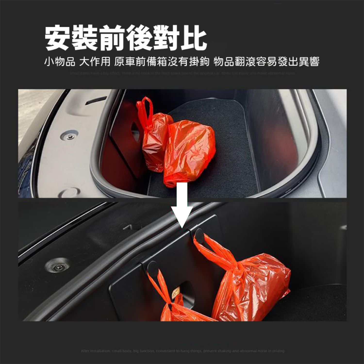 前備箱掛鉤掛勾 顏色:黑色 尺寸:3.5cm x 2.3cm 材質:ABS 物料 規格:1:1 版型專車 適用:Model Y 安裝位置:前備箱 安裝方法:直接對準卡入孔即可,無損安裝,完成掛上試用