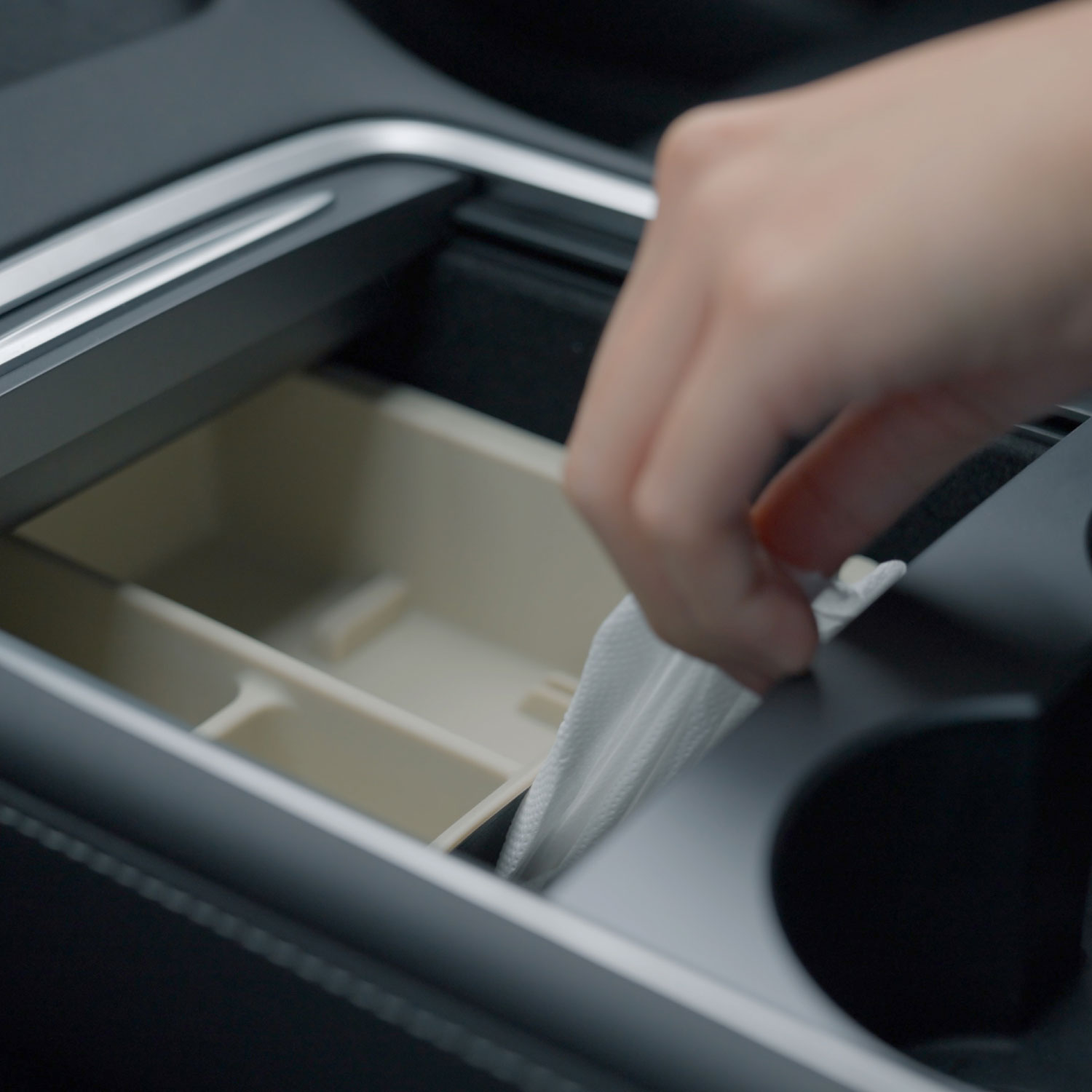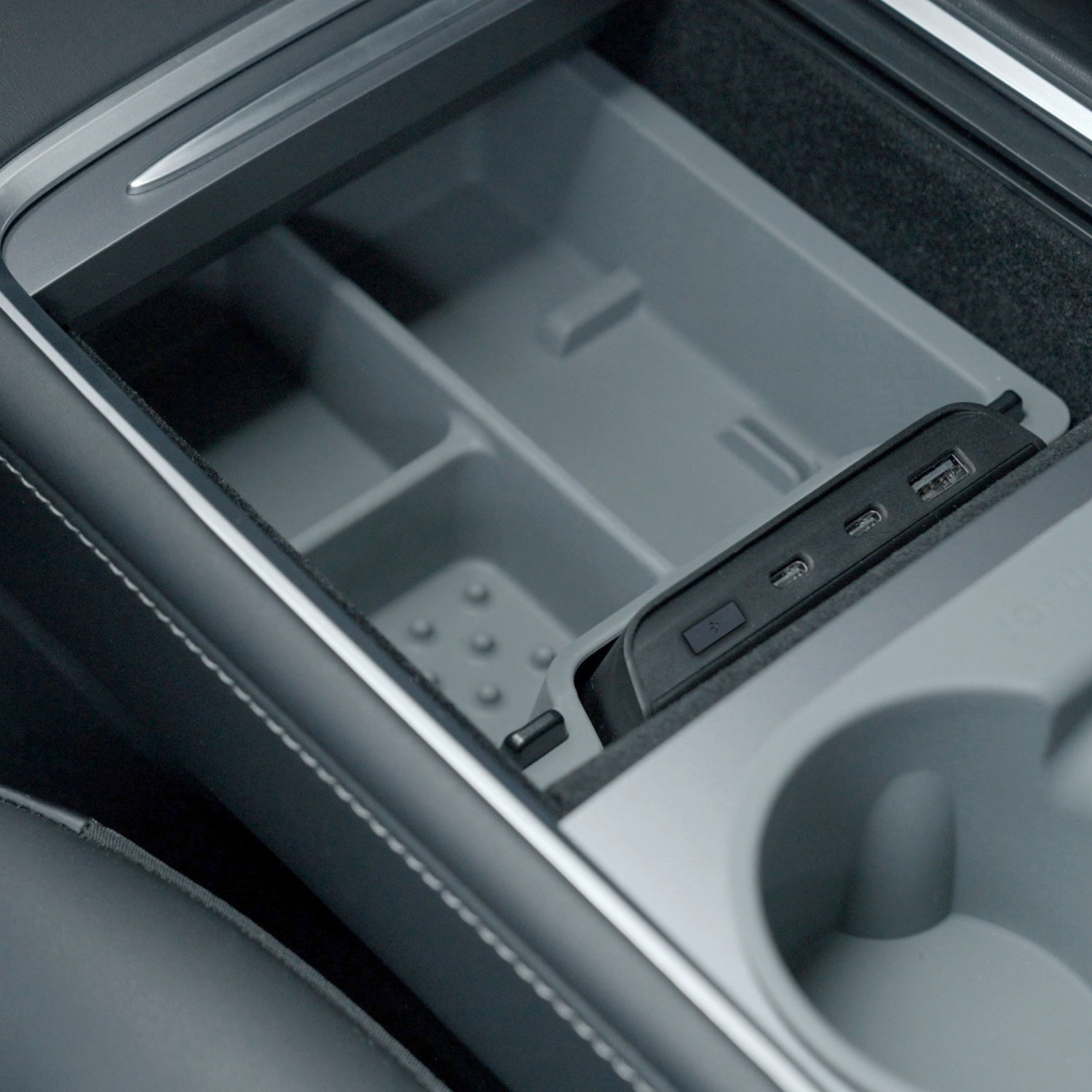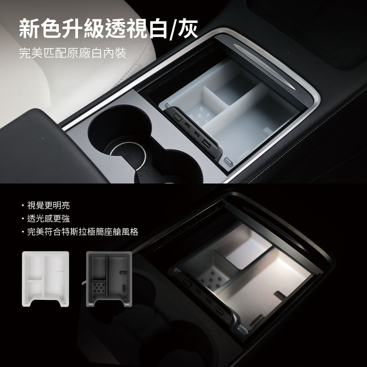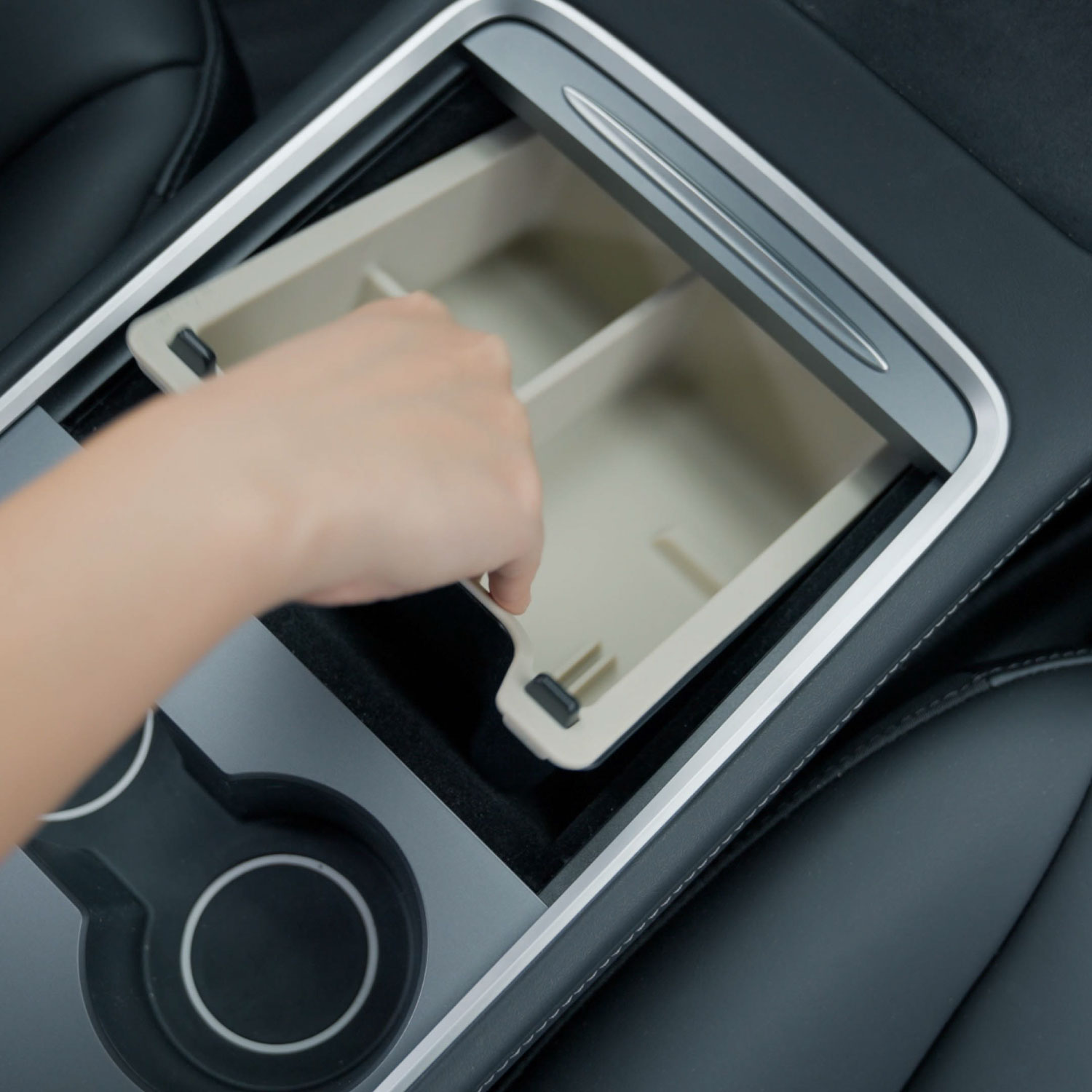 讓車內中控區域更整齊,增加儲物空間以收納太陽眼鏡、特斯拉鑰匙、充電轉接頭、悠遊卡、零錢等隨身小物品