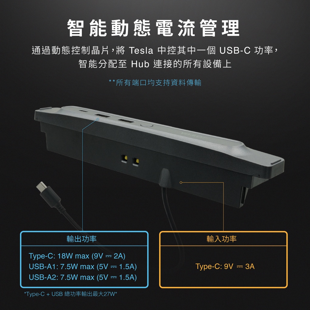通過動態控制晶片,將特斯拉其中一個 USB-C 功率分配至 Mini Hub 連接的所有設備上,根據充電設備所需功率智能動態調整與優化。