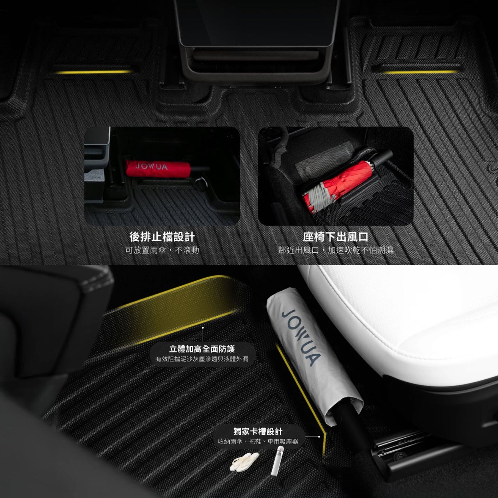 方便主副駕收納雨傘、拖鞋、車用吸塵器等物品。
