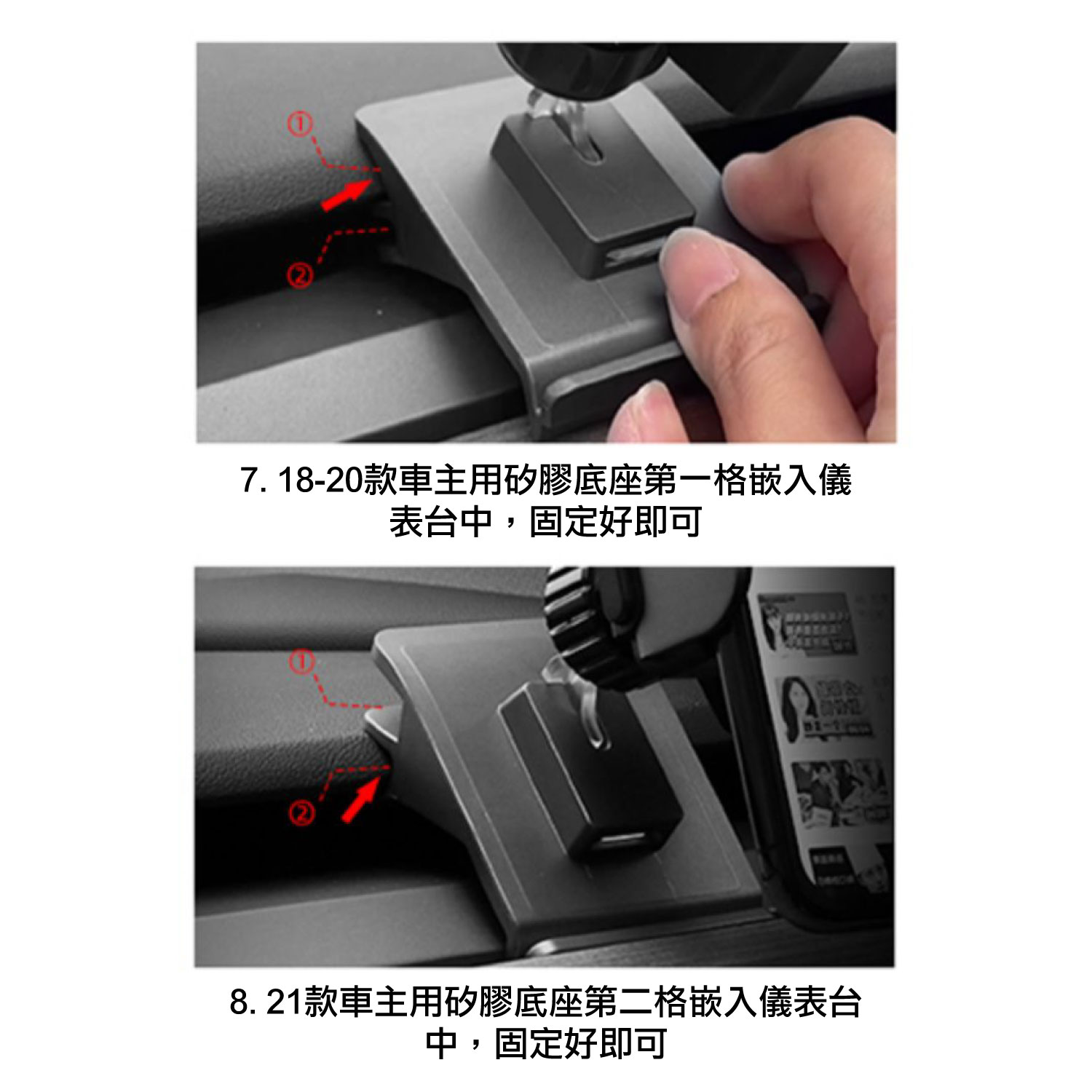- 太陽能儲電,耐熱耐寒 - 充電一次,使用6個月 - 360度橫豎屏調節 - 感應電動夾臂,單手一放自動鎖緊 - 與原車融為一體,大道至簡設計 - 黃金視野,避開方向盤 規格:右駕出風口/活動式款 適用:Model 3/Y,4-7寸手機可用 安裝位置:前座出風口 安裝方法:直接安置,無損安裝 *留意如有加儀表台飾板/原廠白色內飾有機會影響使用,因內飾安裝不合恕不接受退換