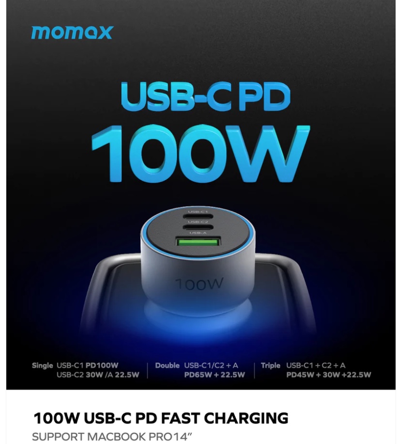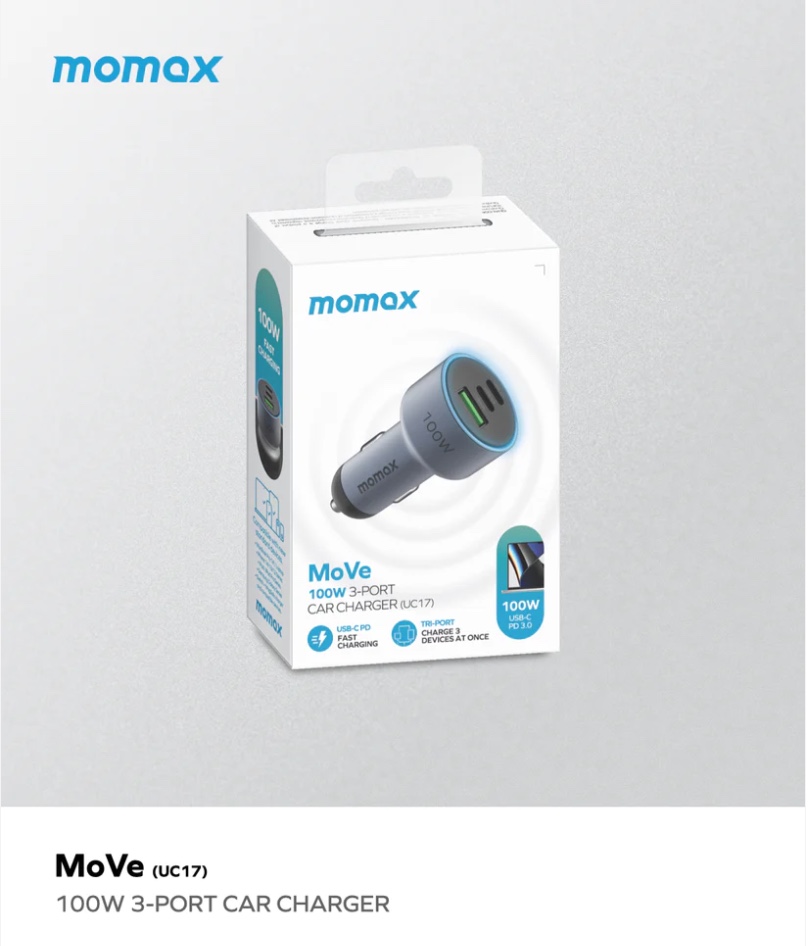 Model S/X/3/Y MoVe 100W 三重快充車載充電器 UC17E | MOMAX 100W超高功率車載充電器,為駕駛者提供極速三重快充的充電方案。隨時為你的筆記本電腦, 平板, 手機同時充電,車上都能實現全方位快充,出行更從容。 100W大功率| 最高支持PD100W,隨時為你的筆記本電腦, 平板, 手機同時充電,車上都能實現全方位快充,出行更從容 廣泛的兼容性| 支持多種快充協議,快速為你的設備充電 環形環境光 | 開啟LED柔光燈,夜間更醒目 人體工學設計 | 優雅的色調,並有防刮擦和防油漆剝落的效果 金屬外觀 | 時尚而亮麗的質感,增強了觸感和使用體驗 規格 輸入: DC12-24V/14A 總輸出: 100W USB-C1 輸出: 5V/3A, 9V/3A, 12V/3A, 15V/3A, 20V/5A (100W Max.) USB-C2 輸出: 5V/3A, 9V/3A, 10V/2.25A, 12V/2.5 (30W) USB-A 輸出: 5V/3A, 9V/2A, 10V/2.25A, 12V/1.5A (22.5W Max.) C1+C2 輸出: 100W C1+A 輸出: 65W + 22.5W C1+C2+A 輸出: 45W + 30W + 22.5W 材料: PC+鋁合金 尺寸: ø35 x 72mm 重量: 45g ±5g