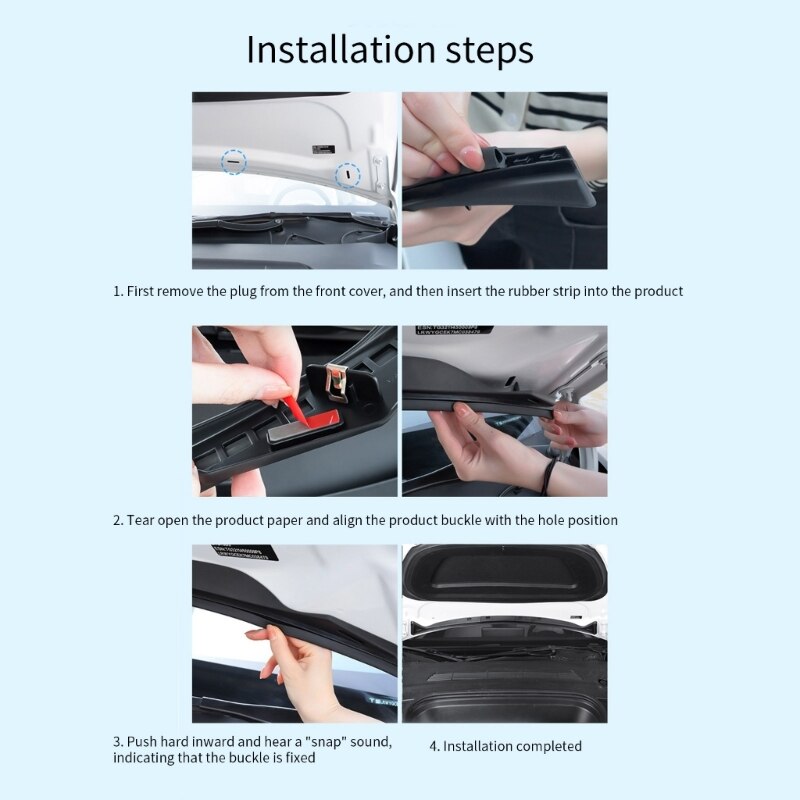 前備箱擋水條 (一體式) 顏色:黑色 材質:ABS 物料 適用:Model Y 安裝位置:車頭冚 安裝方法:直接裝入扣上,無損安裝