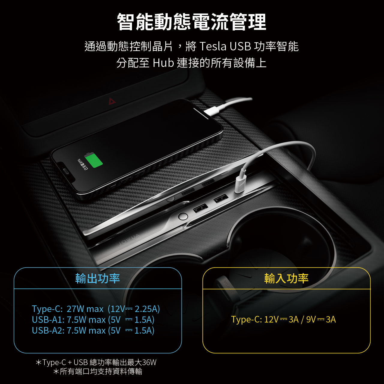 通過動態控制晶片,將特斯拉其中一個 USB-C 功率分配至 Mini Hub 連接的所有設備上,根據充電設備所需功率智能動態調整與優化。