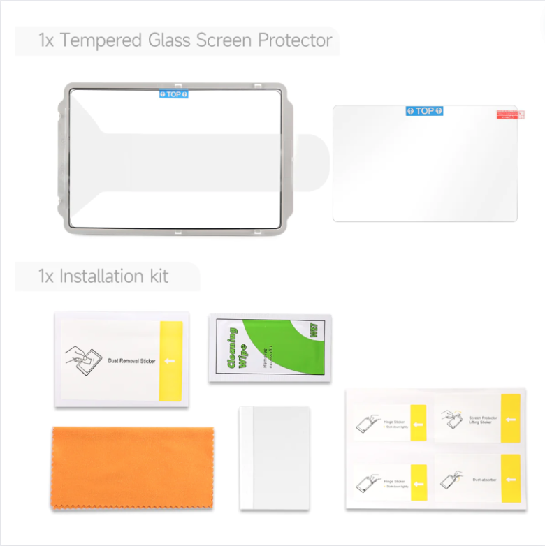 【易於安裝】隨附的自動對齊套件有助於隔離灰塵並在幾秒鐘內輕鬆貼上螢幕保護貼。
