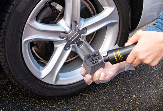 從輪胎的側面或底部開始塗抹,以免液體滴到車輪上,並將其塗抹在整個表面上。