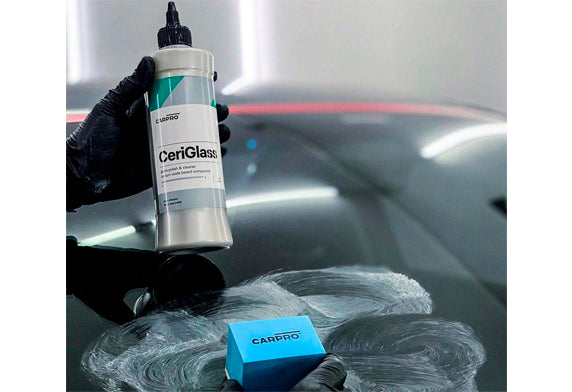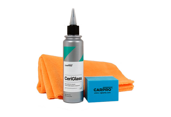 CarPro CeriGlass Kit玻璃清潔及拋光套裝可以在汽車玻璃表面作深層清潔和拋光之用。 CeriGlass Kit以創新的技術將蘊含了氧化鈰(Cerium Oxide)的特殊陶瓷與其他納米成分和溫和磨料混合,研製成這款獨特的玻璃拋光劑。它可以快速去除酸雨漬、污水漬、路面污垢和難清洗的雀屎漬。此外,它亦可以在不損害擋風玻璃 情況下,去除水潑所造成的輕微刮痕和蜘蛛網紋,使玻璃表面晶瑩剔透。對於輕微的水痕,可以手工應用CarPro CeriGlass Kit,效果同樣顯著;對於大範圍、嚴重的水痕或輕微刮痕,最好使用玻璃拋光機和研磨玻璃墊進行操作。