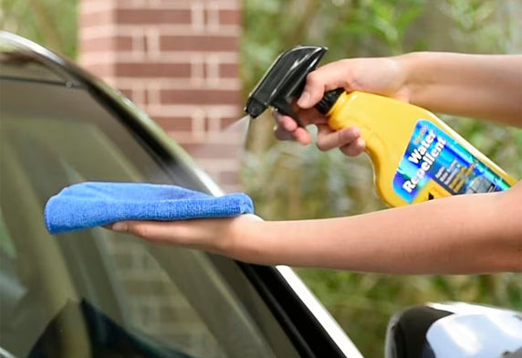 1. 將Rain-X 雨敵玻璃撥水噴劑噴灑於玻璃表面,使用乾淨的布或海綿均勻塗抹。