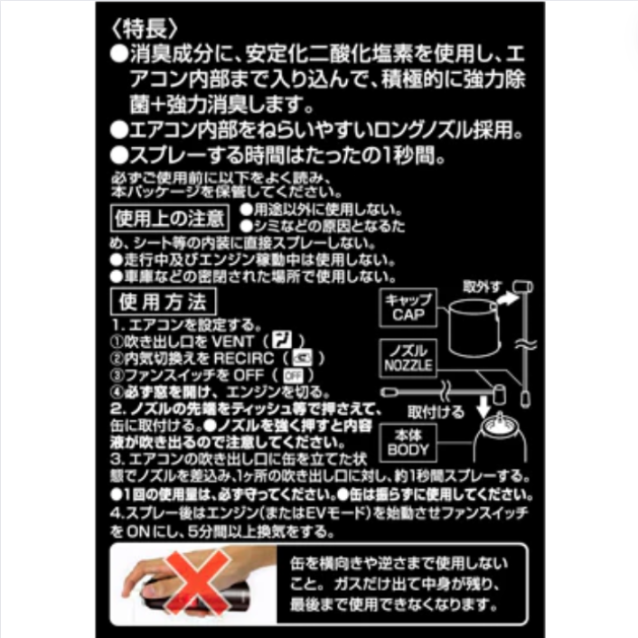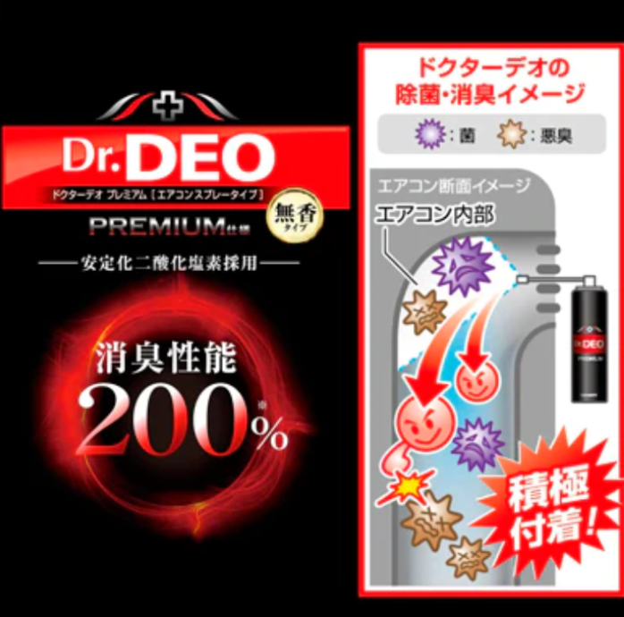 產品描述: 產地: 日本制造 容量: 90ml Dr. DEO Premium汽車冷氣除臭殺菌消毒劑是一款具有200%消臭效能的產品。它採用穩定化二氧化氯作為除菌消臭成分,能夠氧化分解惡臭成分,實現強力的除菌和消臭效果。該產品採用長噴嘴設計,方便噴射到空調系統內部,噴射時間僅需1秒。此產品為無香型,容量為90毫升。 使用方式: 請確保車輛處於停車狀態下,並將引擎關閉。 請調整空調系統至最佳工作狀態,並將風扇調至最大。 打開車內空調出風口,確保空氣能夠循環流通。 搖晃本產品均勻,將噴嘴對準空調出風口。 按下噴霧劑頂部的按鈕,均勻噴射產品內容物到空調系統內部。 噴霧時間建議約1秒,以確保均勻分佈。 噴霧完成後,關閉車內空調出風口。 開啟車輛引擎,讓空調系統運作約10分鐘,以確保產品能夠有效進入空調系統。 使用後,請確保產品瓶蓋緊閉,存放在陰涼乾燥的地方。