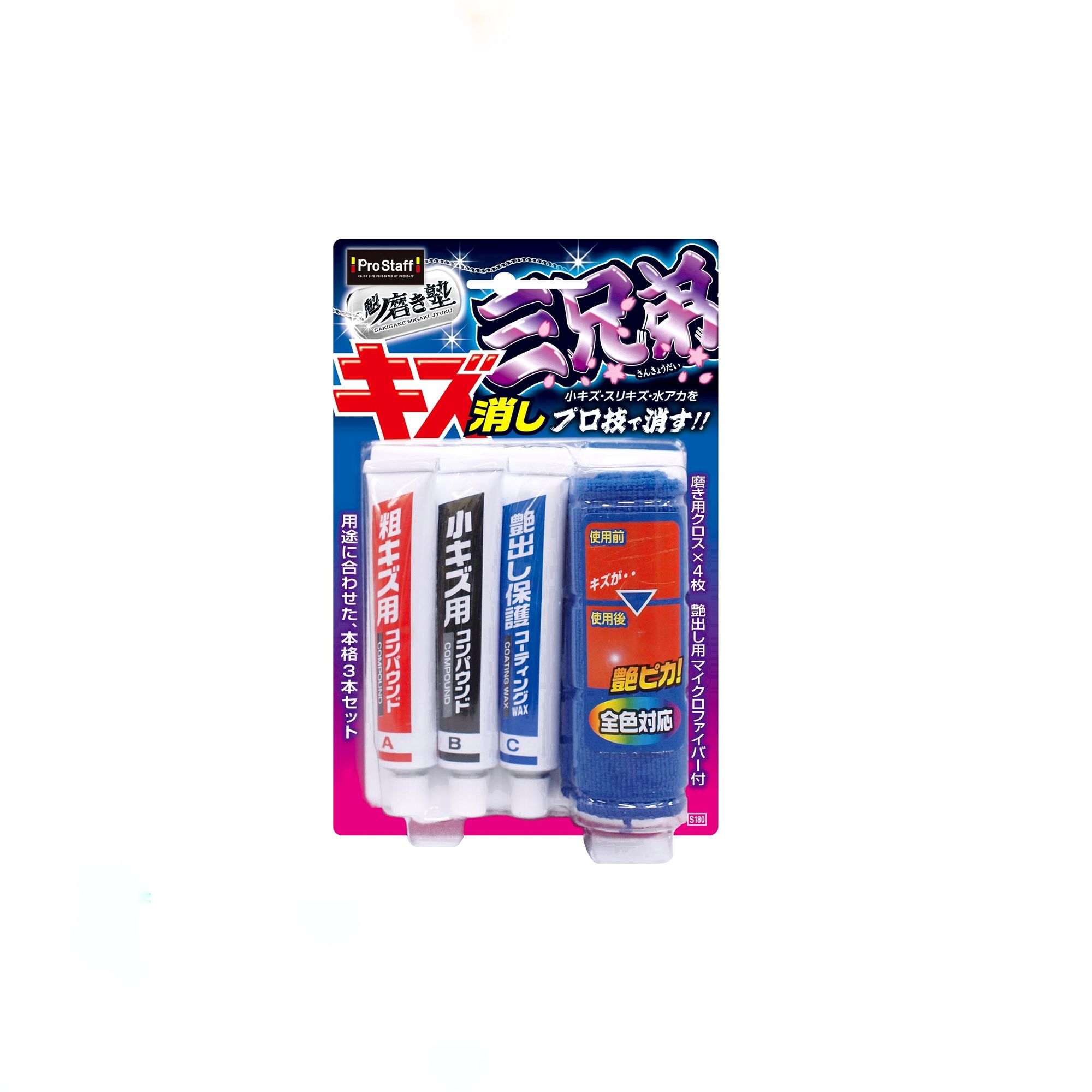 三兄弟系列 - 粗中幼去花痕研磨套裝 (輕量版)包含三支車漆專用修復劑和一塊專用抹布。其中包括「粗糙刮痕用複合劑」、「細微刮痕用複合劑」和「恢復光澤保護蠟」,根據刮痕的狀況可以選擇使用不同的產品。這套套裝設計簡單易用,任何人都可以輕鬆達到專業效果。此外,它還可以徹底清潔水痕、雨漬等污垢,徹底護理車身細節。