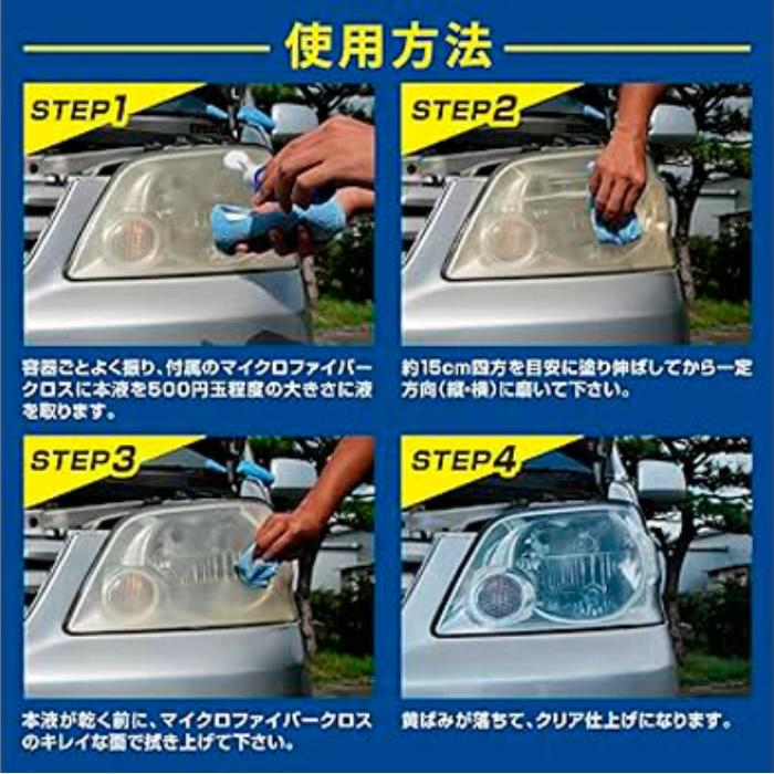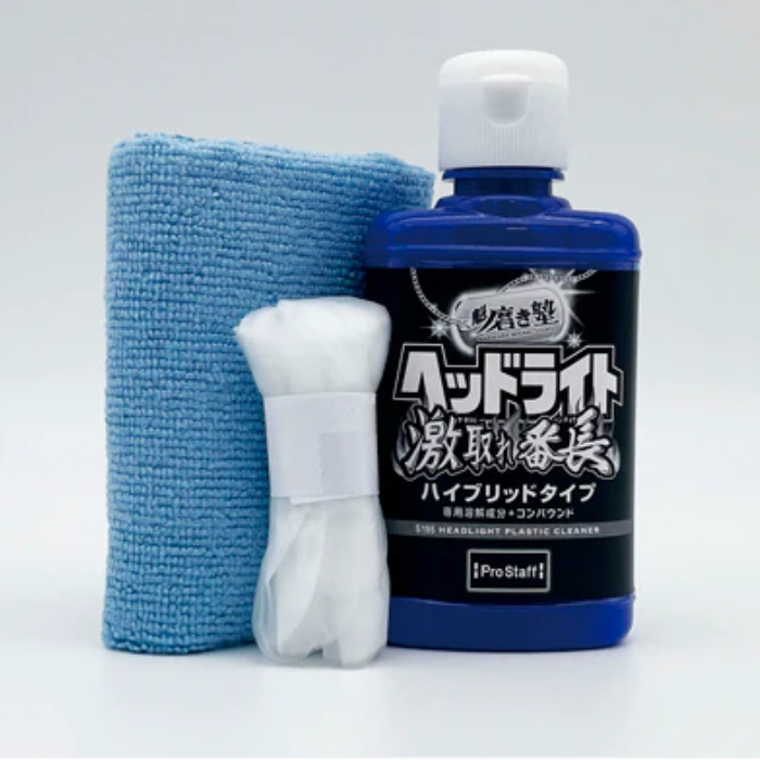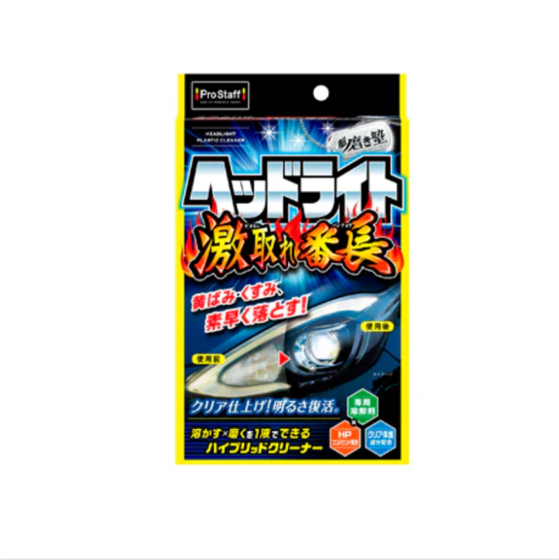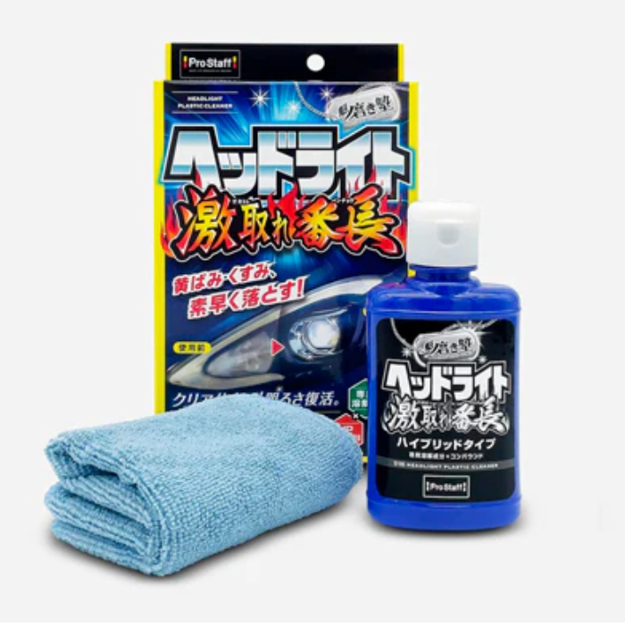 商品描述: ProStaff車頭燈去黃修復鍍膜套裝 (升級版)是一款專為汽車頭燈設計的清潔劑,可以迅速去除頭燈上的黃變和暗沉,使其恢復清澈的亮度。 這款頭燈清潔劑使用專用的溶解劑和研磨劑的混合配方,可以快速去除頑固的黃變和暗沉。同時,它還含有保護成分,能賦予頭燈清晰的光澤,讓頭燈看起來非常清澈明亮。此外,您還可以使用它來清潔尾燈和車門擋雨板。配套附有專用抹布和手套,方便快速進行操作,只需使用這一款產品,就能輕鬆恢復頭燈的原始光澤。 使用說明: 1.清洗使用部位的沙土和泥汙,並將其充分沖洗乾淨。 2.充分搖勻容器,使用附帶的微纖維抹布取出約5毫子大小的清潔劑液體,均勻塗抹於頭燈表面,大約15平方公分大小,然後以一定方向(垂直或水平)進行磨擦。 3. 在清潔劑乾燥之前,使用微纖維抹布的乾淨面將其擦拭乾淨。