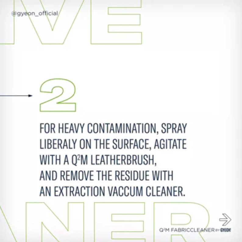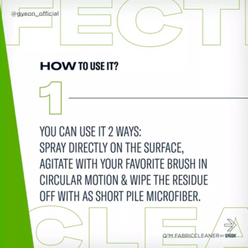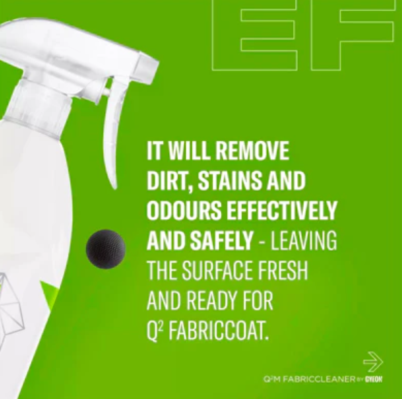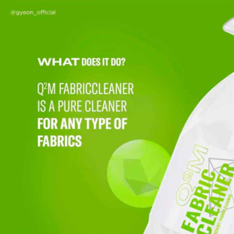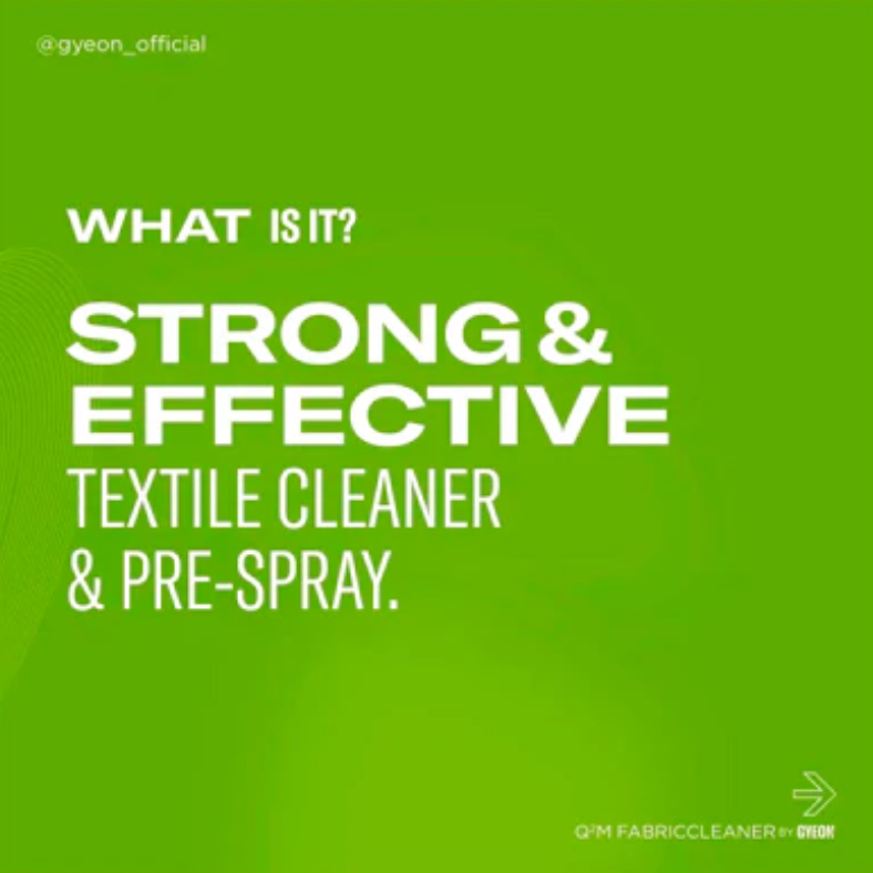 GYEON Q²M FabricCleaner 麂皮專用清潔劑是一種強效清潔麂皮織維座椅的強大清潔劑。其配方經過設計能有效地去除各種織維上的污垢、污漬和異味。使用後,室內環境變得清新和乾淨,其後更可進一步使用 Q² FabricCoat 進行保護。