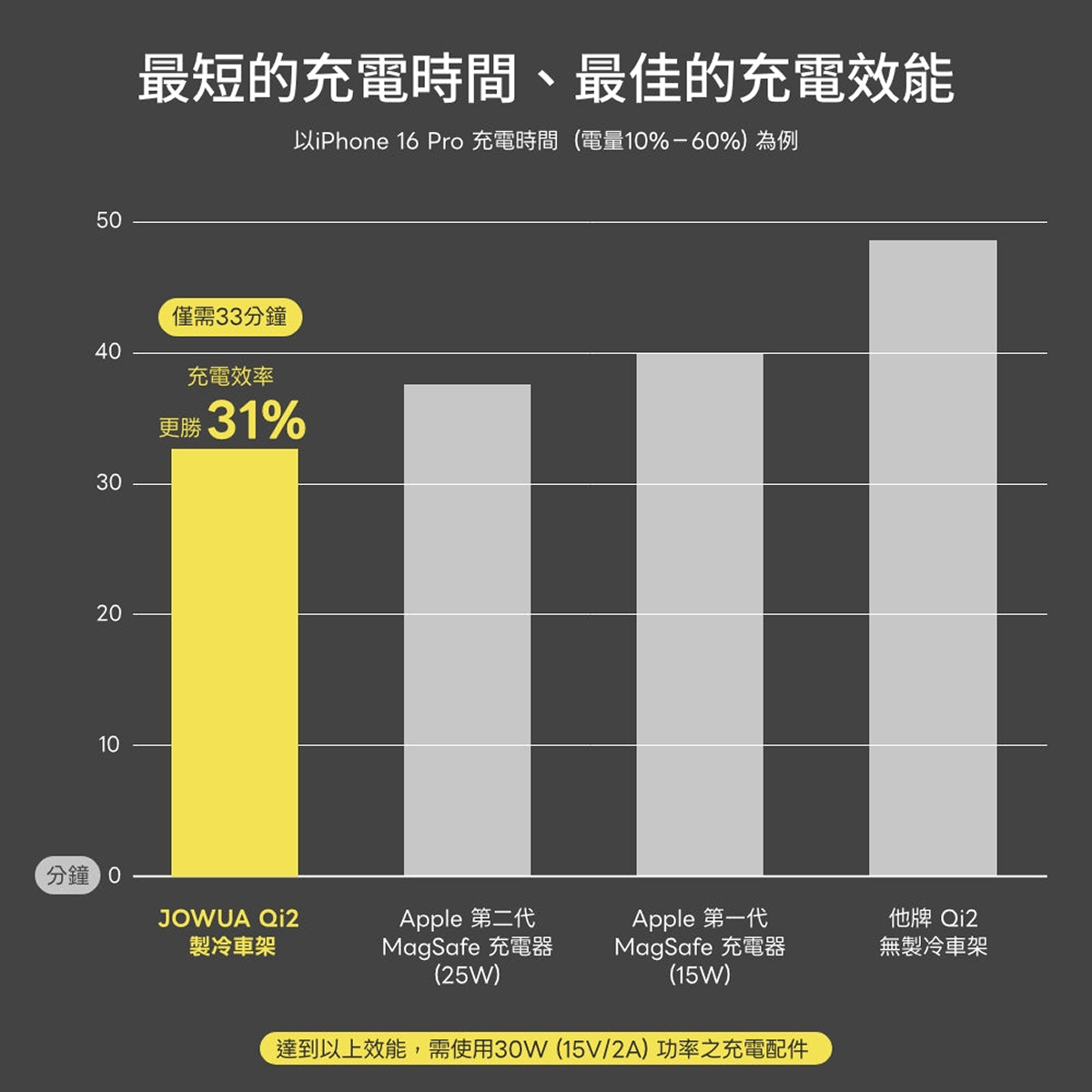 為達Qi2 製冷無線充電車架之最佳充電效能,需請使用30W (15V/2A) 功率之充電配件