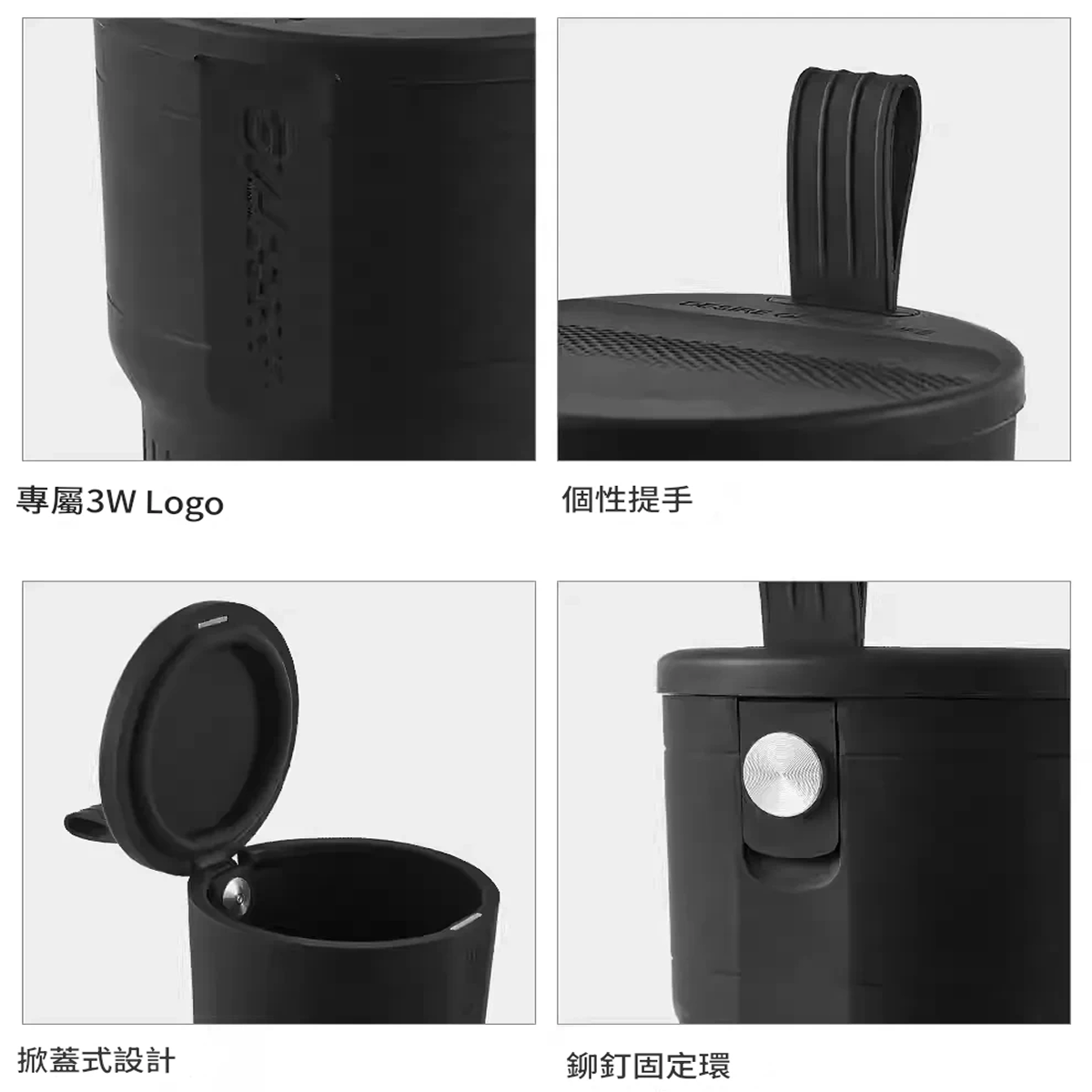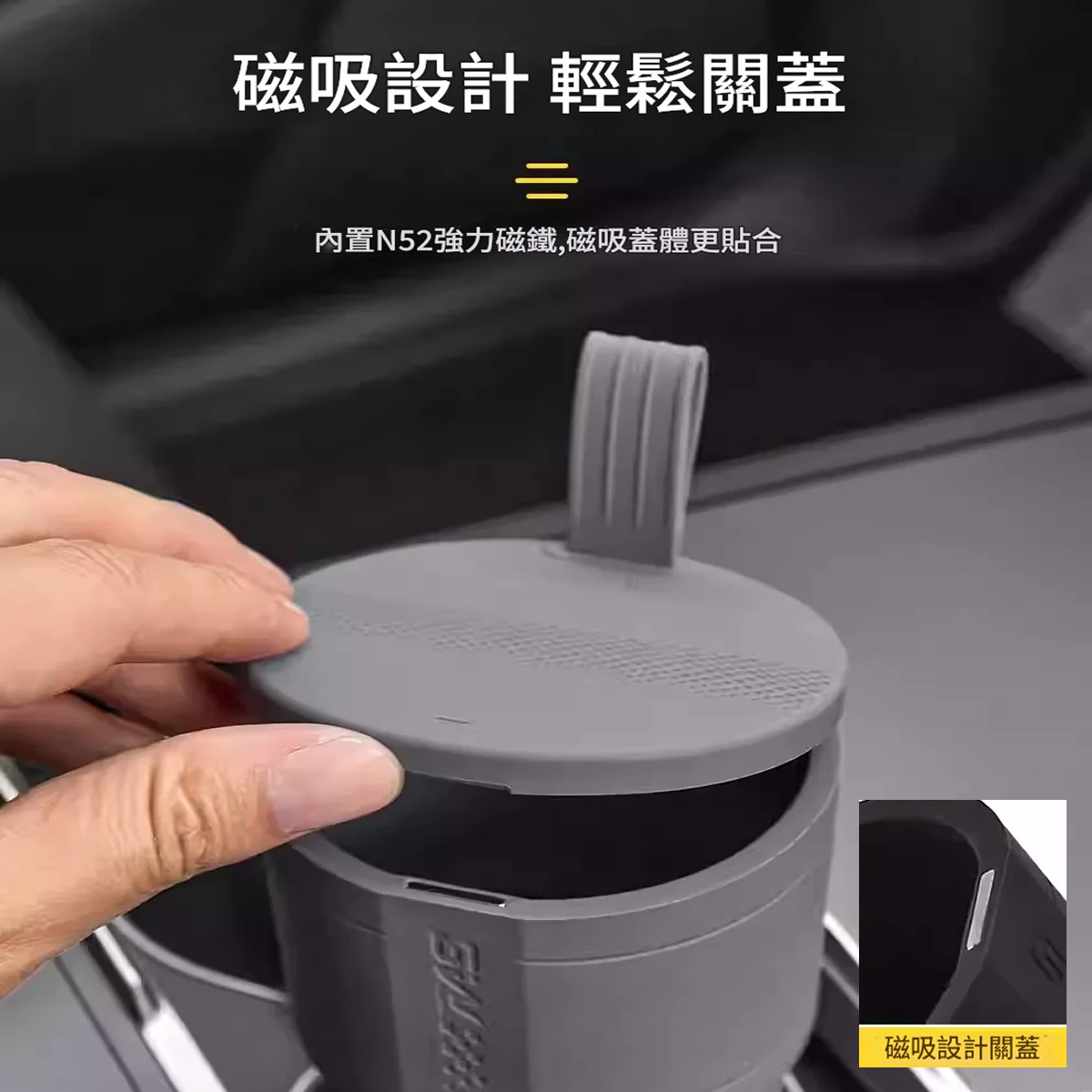 垃圾入桶 告別髒亂 輕鬆搞定瓜果、紙屑,保持愛車整潔 無需垃圾袋 全身可水洗 告別裝配垃圾袋的繁瑣,一取一沖輕鬆打理 帶蓋出遊 拒絕異味 掀蓋式設計,無需分離蓋體,輕鬆鎖住垃圾異味 磁吸設計 輕鬆關蓋 內置N52強力磁鐵,磁吸蓋體更貼合 磁吸設計關蓋 個性提把 空間智慧 可搭配車內掛鉤,任意放置垃圾桶 /可手提隨時攜帶 液態矽膠 柔韌環保 反覆揉捏不變形,柔軟高回彈,安全無異味 車居兩用 生活能手 不止在車內,也是你的個性居家垃圾桶 原車原色融為一體 用經典的原廠車色點綴車內,保持統一視覺: 灰色/米白色/黑色