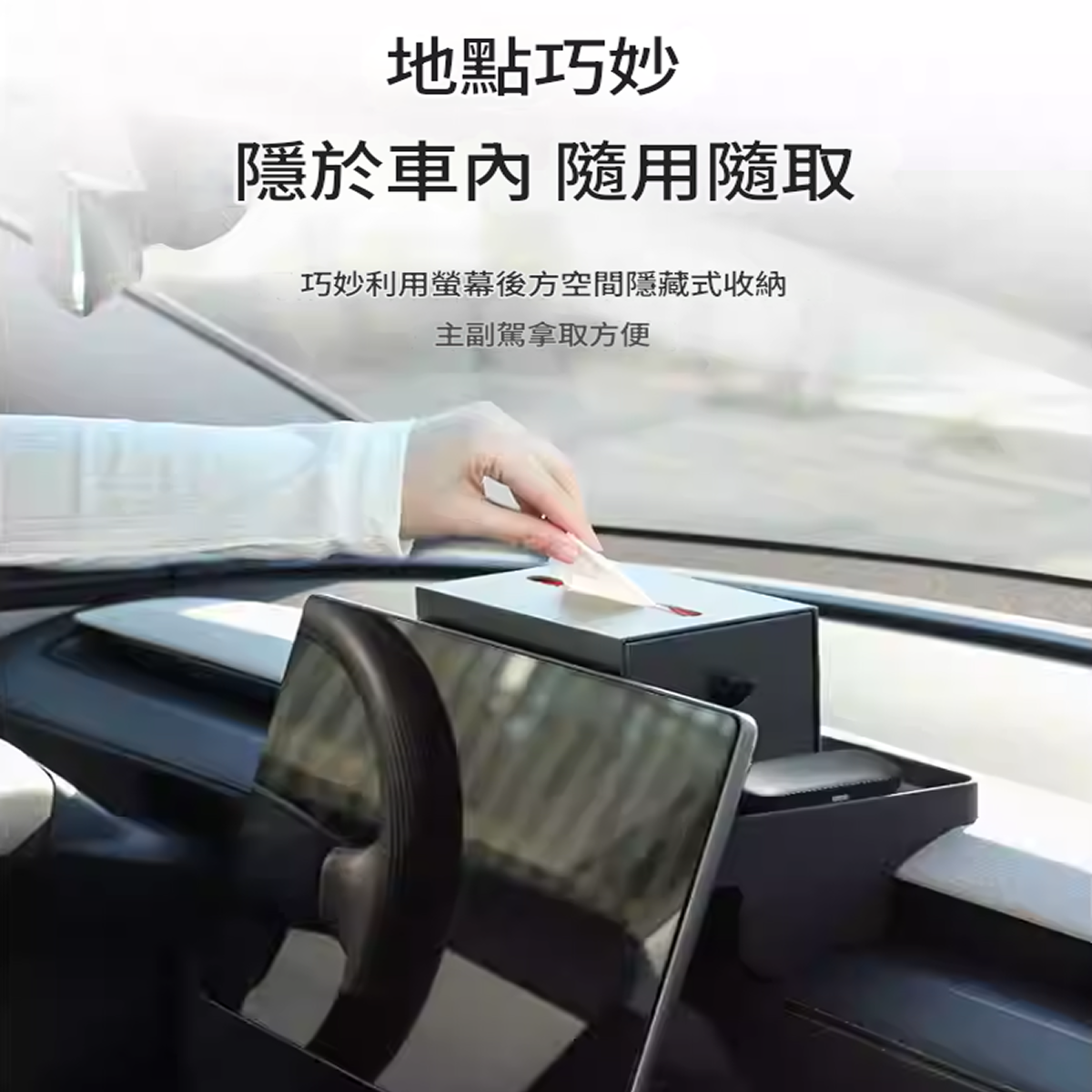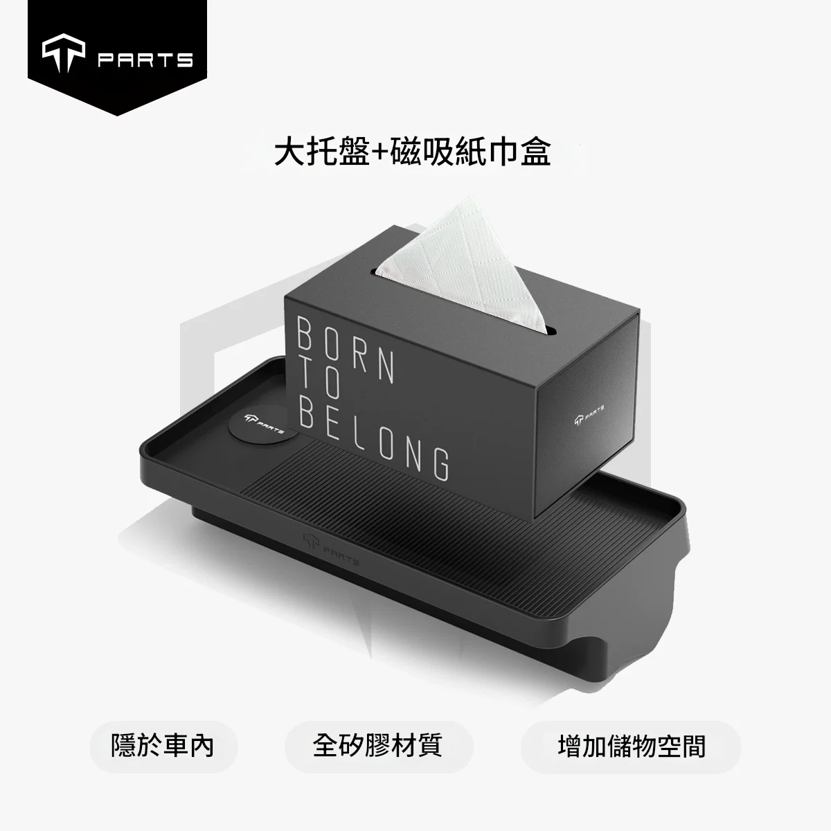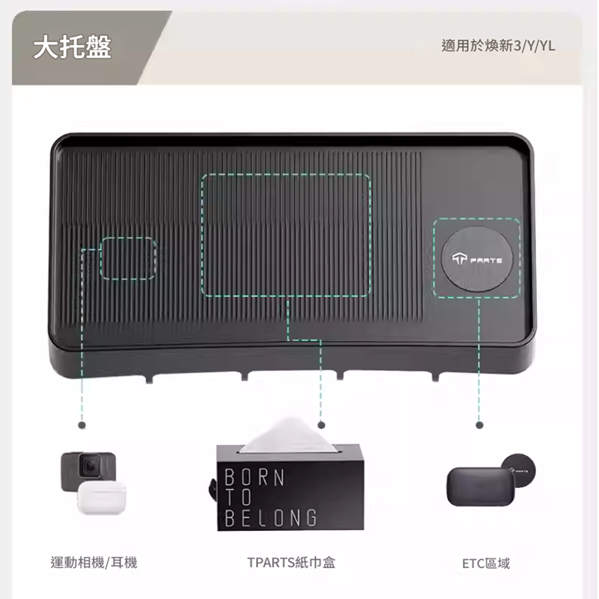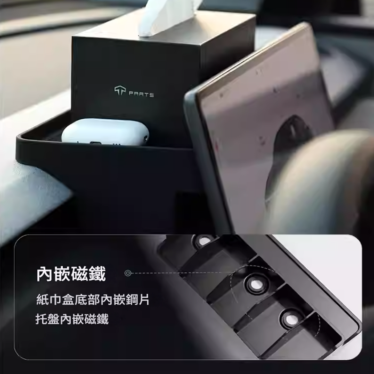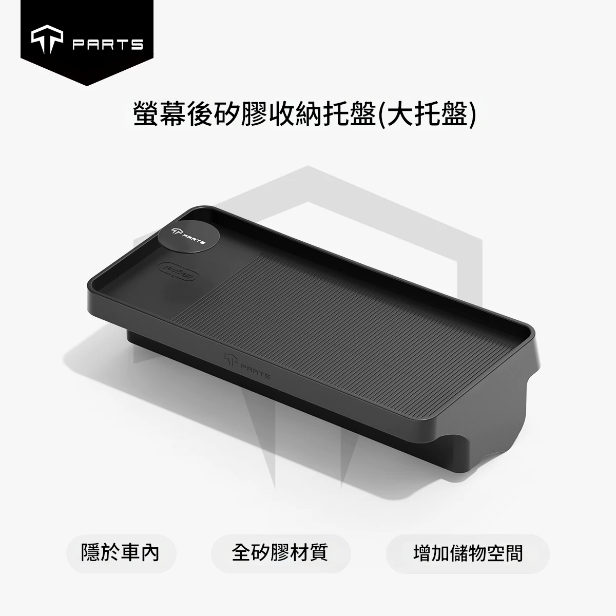 TPARTS 螢幕後矽膠收納托盤 矽膠材質無異響 隱於車內 位置巧妙,隨用隨取 巧妙利用屏幕後方空間隱藏式收納主副駕拿取方便 合理劃分區域 多功能儲物 告別凌亂 更合理的分隔設計,單獨ETC放置區收納紙巾、眼鏡及小物件更方便 隱藏式磁吸卡位 附送磁吸片,穩固行駛不掉落 原車開模 緊密貼合,不傷車身 環保矽膠物料 無異味,耐高溫不變形 防灰塵容易打理 便捷安裝 嵌入式設計,一放一卡即可 一體成形 加倍物料,持久耐用