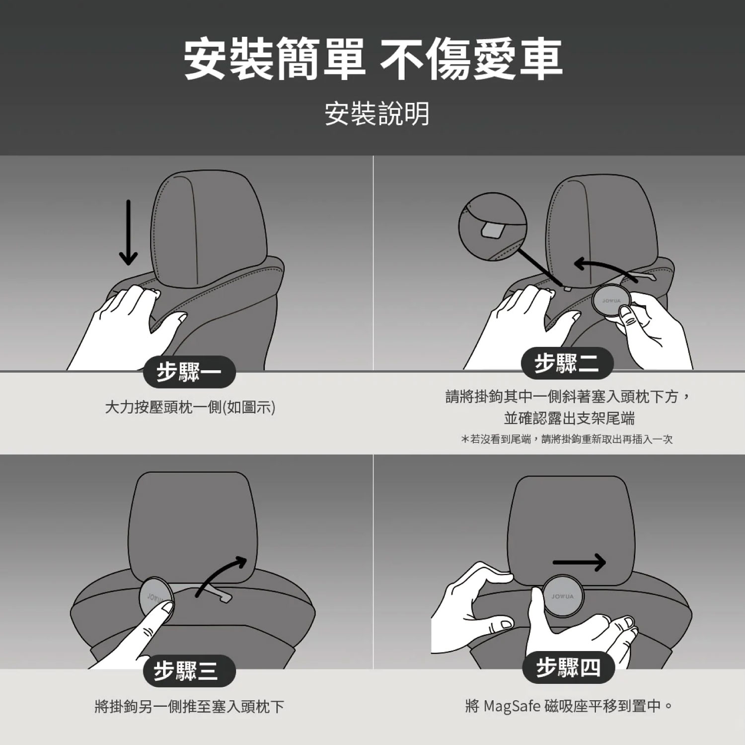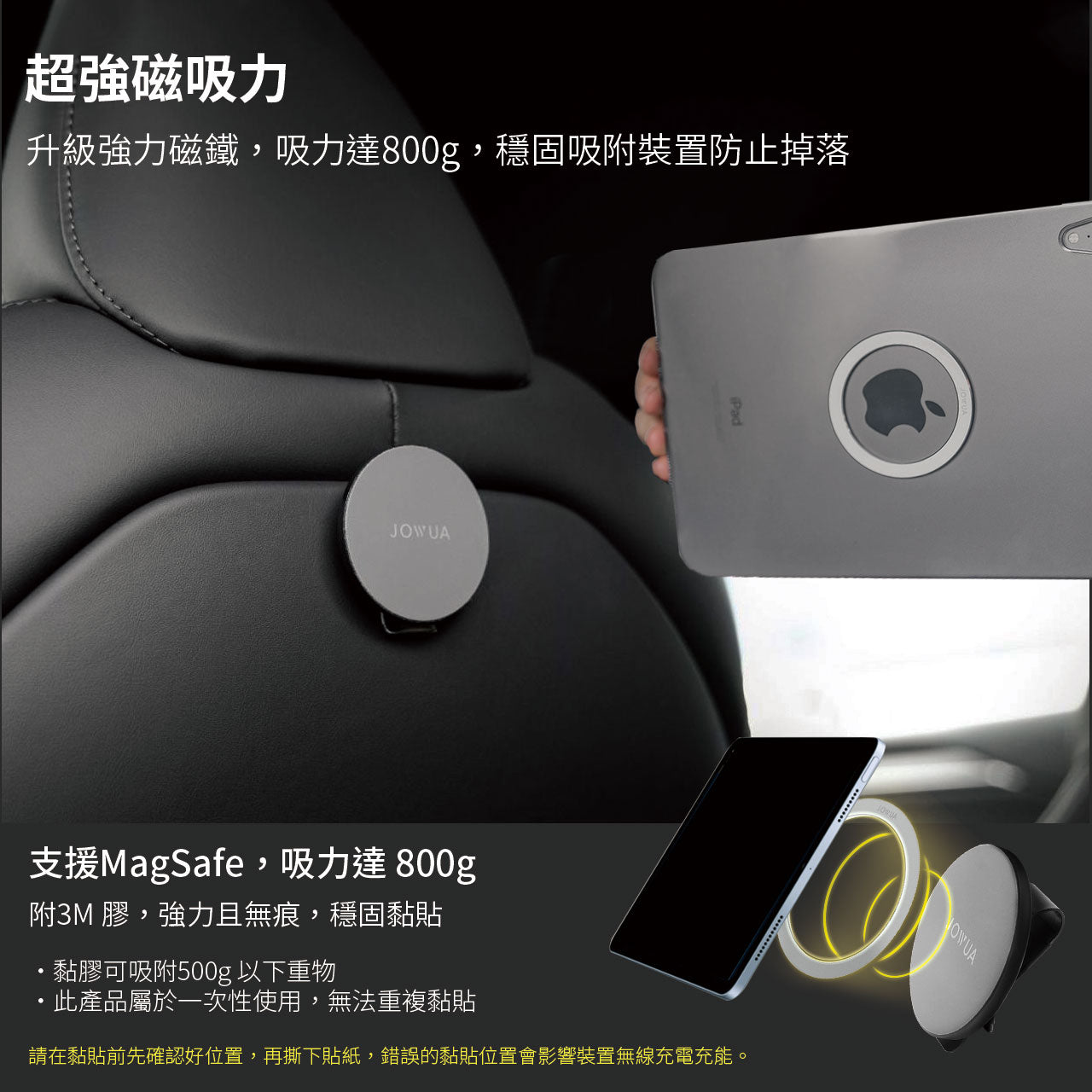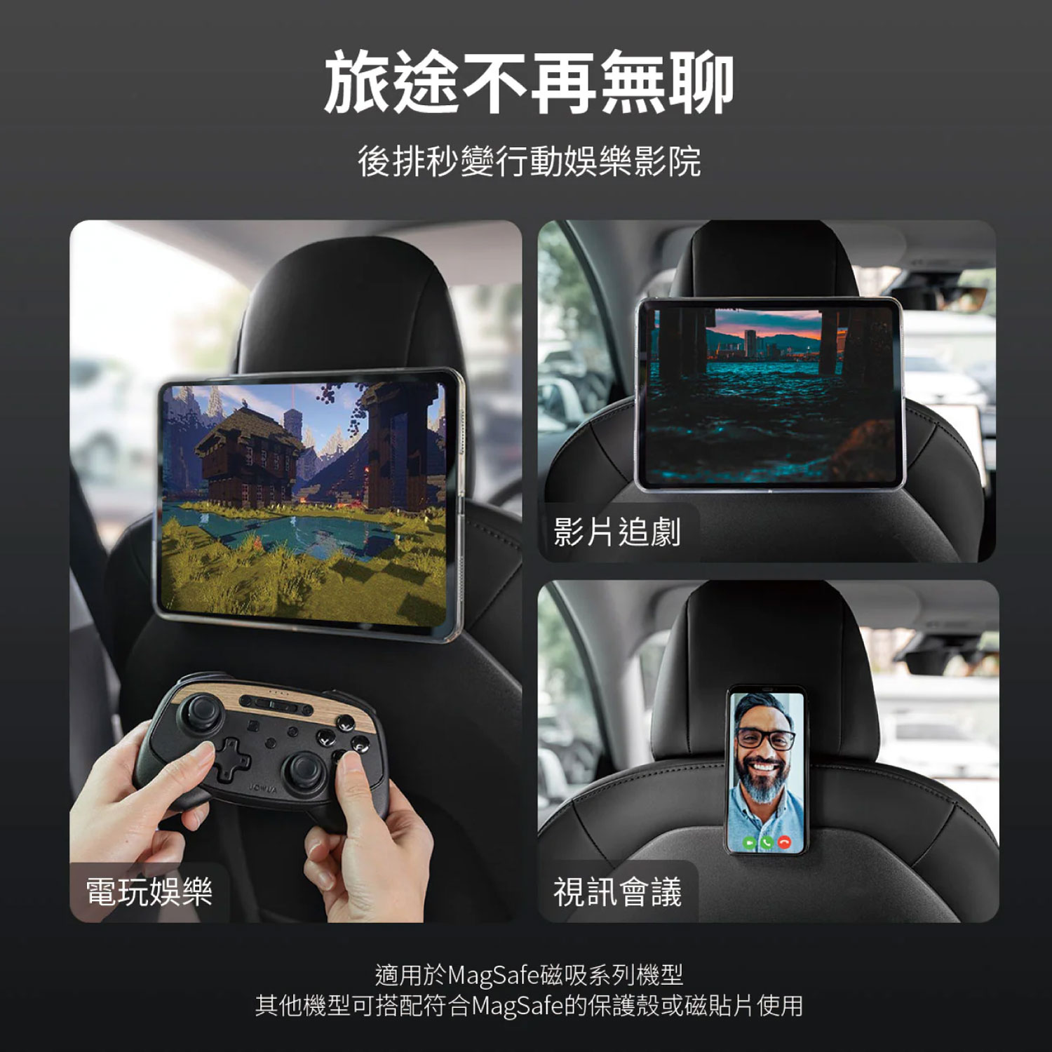 安撫小孩神器 讓後排秒變行動電影院,旅途不再無聊。 支援 iPhone MagSafe 磁吸 適用於 iPhone MagSafe 磁吸系列機型與 MagSafe 磁吸手機殼。 替裝置升級 MagSafe 磁吸 我們的磁圈比普通鐵片吸附更穩,貼在裝置/保護殼外(接收端),即可搭配掛鉤使用。 搭配 MagSafe 面紙盒組合 方便後排乘客或是安全座椅上的孩童抽取面紙。 搭配磁吸線 方便充電,且避免在車內拉斷線材。 掛鉤功能 擴充車內收納空間,讓您隨心所欲掛置雨傘、購物袋。 MagSafe 磁吸掛鉤組 椅背磁吸掛鉤(送引磁環) MagSafe 磁吸紙巾盒 ⚠️ 此組合不適用於 Performance 版本車款。