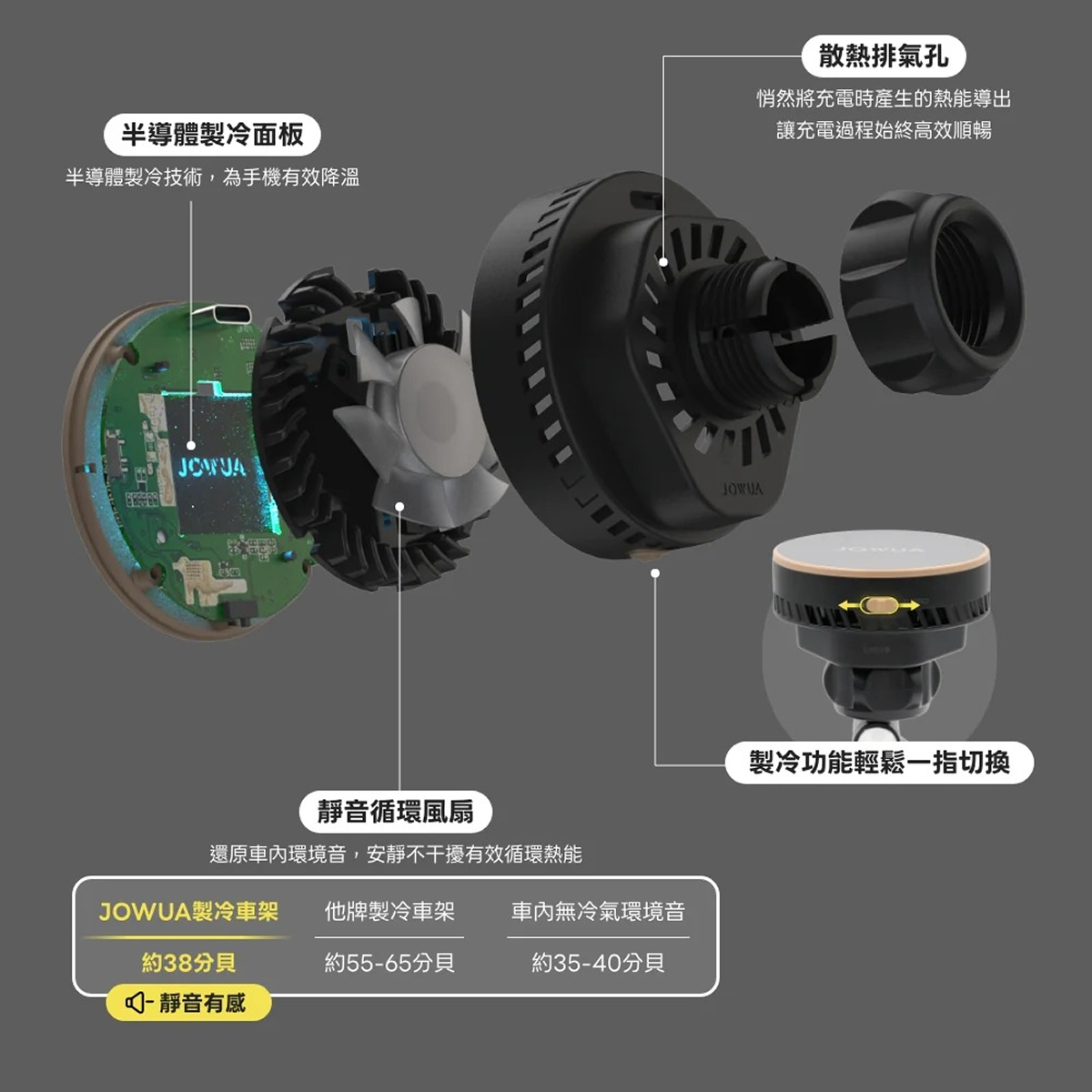 半導體製冷面板:車架面板升級製冷技術,產生冰冷感。使手機降溫,保持最佳充電效能。