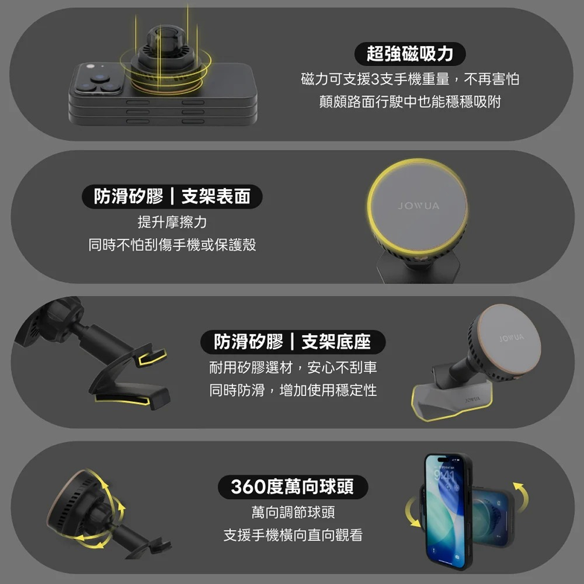 接觸面採用矽膠材質,呵護手機或保護殼不刮傷,並防止手機滑落