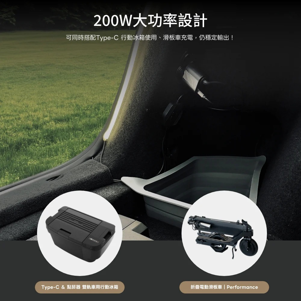 安心結合高瓦數設備,搭配JOWUA Type-C 車用行動冰箱、折疊電動滑板車系列配件,穩定供電