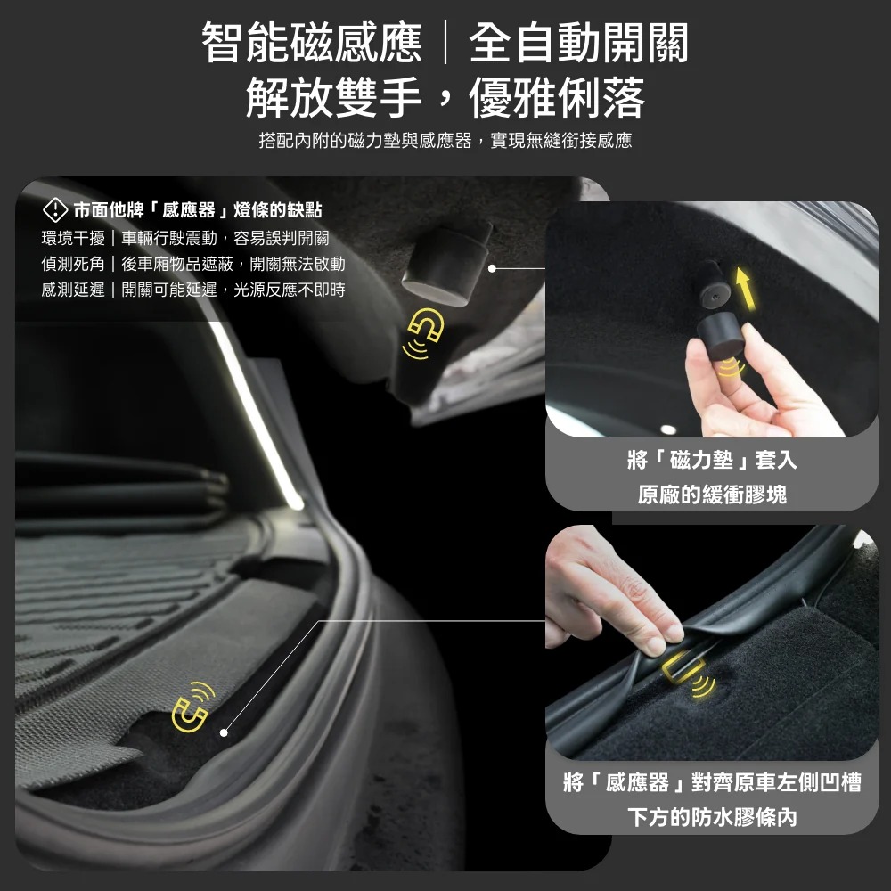 搭配內附的「磁力墊」與感應器無縫銜接。後車廂開啟,光線隨即亮起;後車廂一關,光線自動熄滅。不需手動開關,優雅又俐落!