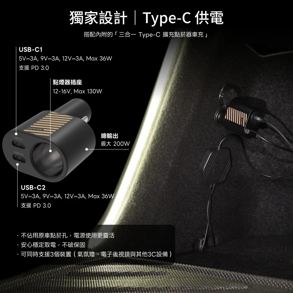 採用Type-C介面,搭配內附的「三合一 Type-C 擴充點菸器車充」不佔用原車點煙孔,電源使用更彈性靈活