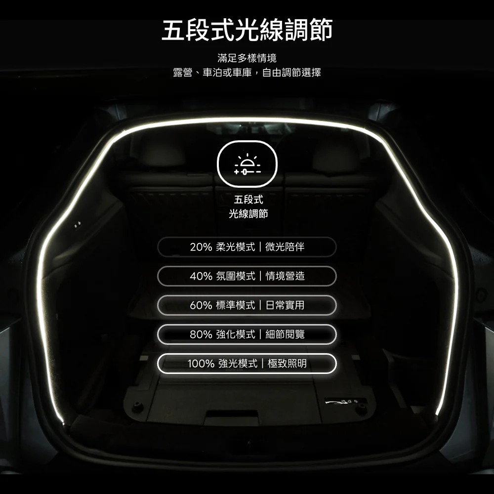 控制器按鍵自由調節,從 20%柔光 到 100%強光,五段式多選擇。滿足露營、車泊等多種情境